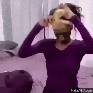 Person in purple shirt applies a bandana or wig cap over their hair, preparing for a new look.