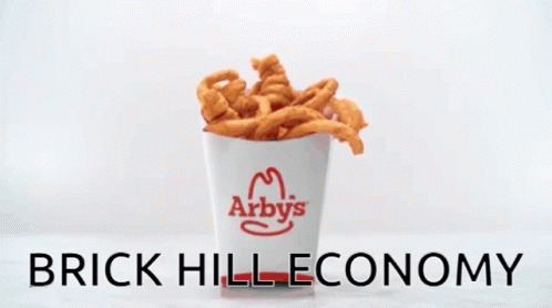 A bucket of Arby's curly fries is displayed on a white background, with 'BRICK HILL ECONOMY' text below.