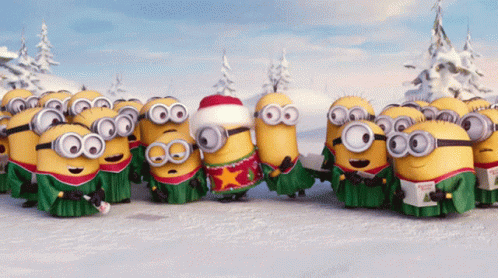 Minions celebrate Christmas, caroling in a snowy winter wonderland.