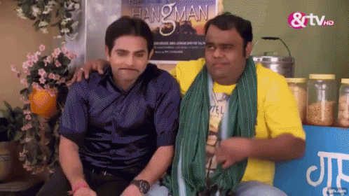 Malkhan and Tika from Bhabhiji reacting to something funny, with one covering his face and the other laughing.