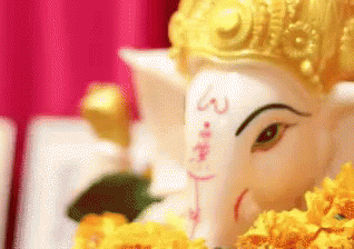 Close-up of a beautiful Ganesha idol adorned with flowers during a puja ceremony.