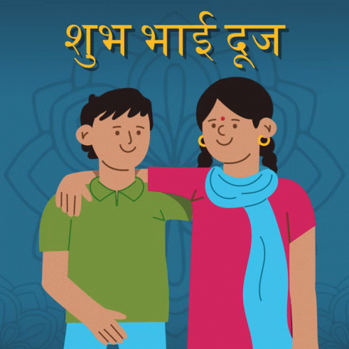 A heartwarming cartoon illustration of a brother and sister celebrating Bhai Dooj, with 'Happy Bhai Dooj' text.