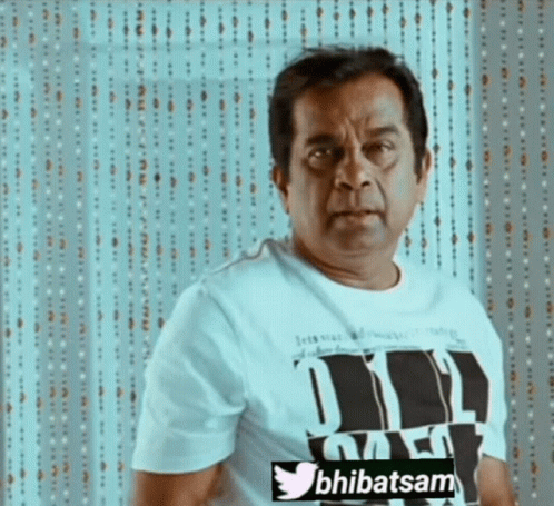 Indian actor Brahmanandam reacts with a 'bhibatsam' expression, adjusting his t-shirt in a comedic moment.