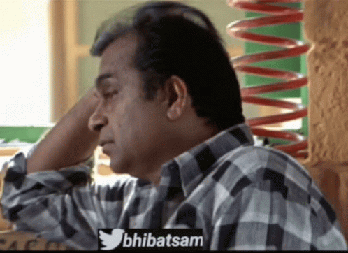 Brahmanandam looking sad and thoughtful, wearing a plaid shirt, in a scene reflecting a 'bhibatsam' mood.