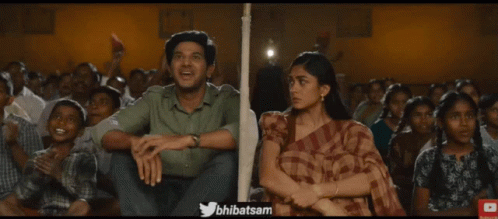 Dulquer Salmaan looks excited while Mrunalini Thakur leans on a pole in a crowd, from #bhibatsam.