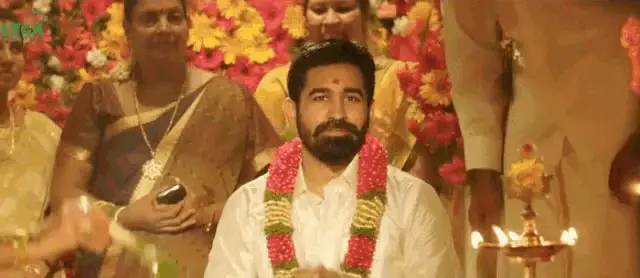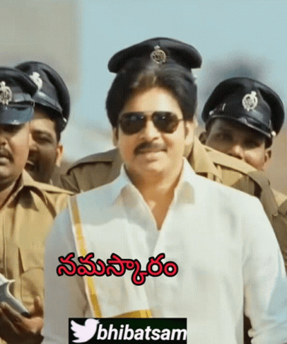 Pawan Kalyan as Gabbar Singh greets with a namaskaram gesture, surrounded by police officers.