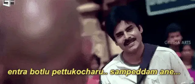 Pawan Kalyan in a scene from Bhibatsam Jalsa, speaking emphatically with the caption 'Kastalu Ela Untayo Nenu Cheptanu Nuvu Vinu'.
