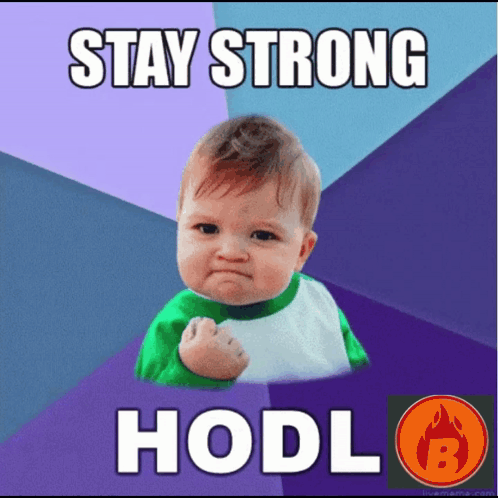 Success Kid meme with text 'STAY STRONG HODL', featuring a determined baby with a clenched fist.