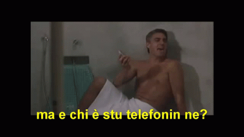 Biagio Izzo, shirtless in a sauna, questions who is on the phone he's holding.