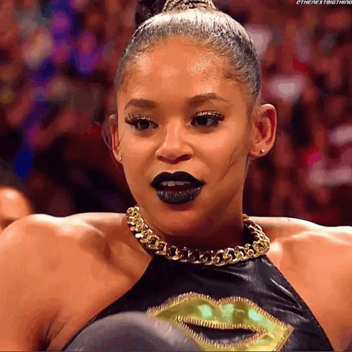 Bianca Belair, the WWE superstar, intensely licking her lips during a wrestling event.