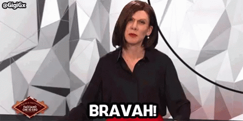 Virginia Raffaele impersonates Bianca Berlinguer, exclaiming 'Bravah!' and 'Complimenti!' on stage.