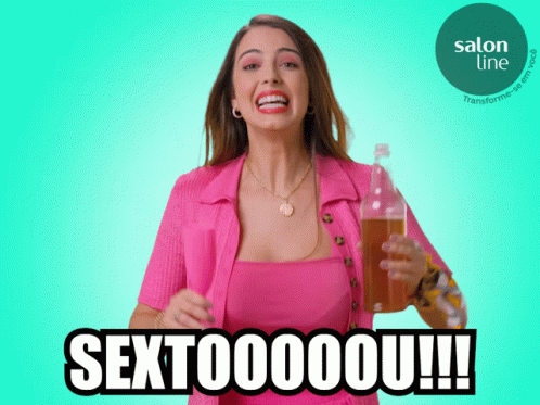 Bianca Camargo joyfully exclaims "Sextou!!!" while holding a drink, promoting Salon Line products.