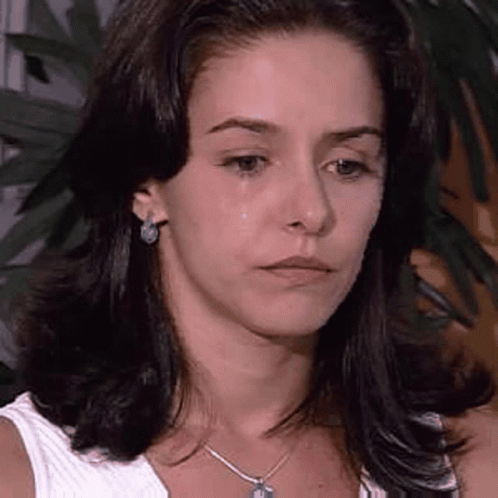 Bianca Record crying with a tear running down her face, wearing a white tank top and a necklace.