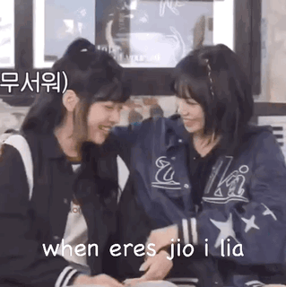 Jio and Lia share a warm hug on a couch, smiling happily, with a caption referencing their names.