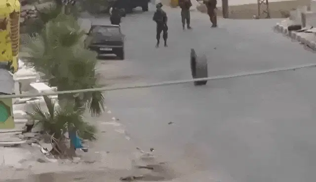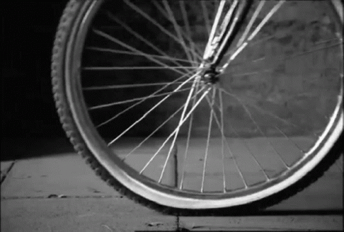 A close-up, black and white view of a bicycle wheel with a flat or damaged tire.