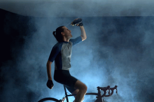 A male cyclist in full gear, including Munbaik clothing, takes a refreshing drink from a water bottle during an intense indoor ride.