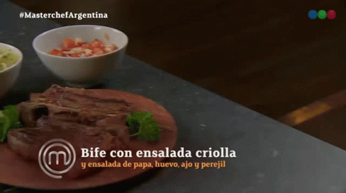 Delicious Bife con Ensalada Criolla and potato salad from Master Chef Argentina, featuring egg, garlic, and parsley.
