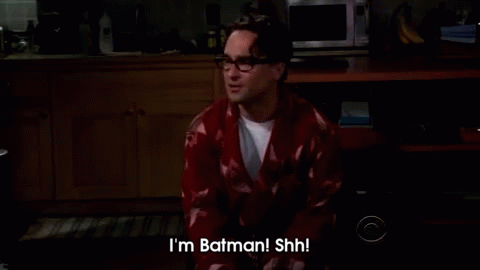 Sheldon Cooper from Big Bang Theory whispers 'I'm Batman! Shh!' while sitting on a couch.