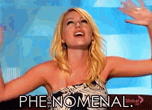 Nicole Franzel from Big Brother reacts with arms outstretched, exclaiming 'Phenomenal!' in an excited and dramatic moment.