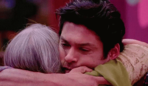 Sidharth Shukla shares an emotional hug with an older woman during Bigg Boss Season 13, showing a tender moment.