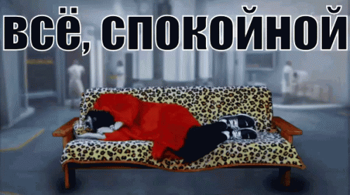 Big Russian Boss is seen sleeping soundly on a distinctive leopard print couch, with Russian text 'That's it, good night' displayed.