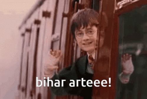 Harry Potter waves goodbye from a train window with the phrase 'Bihar Arte!' displayed.