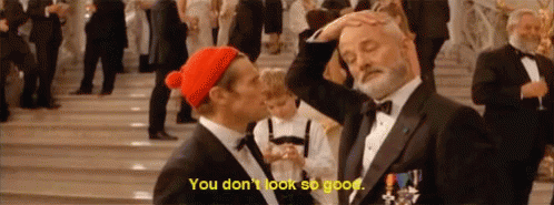 Bill Murray, in a tuxedo, has his head touched by Owen Wilson while a third person says, 'You don't look so good.'