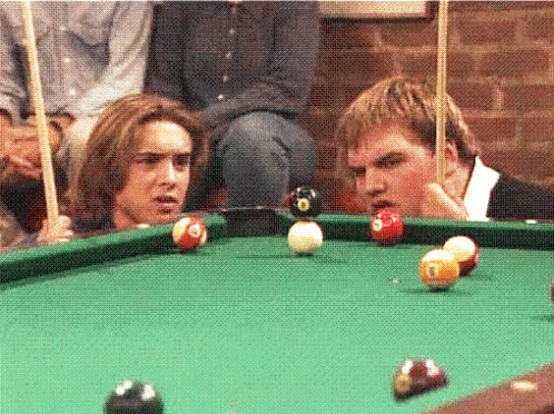 Two men intensely focused on a critical shot during a game of billiard snooker, surrounded by spectators.