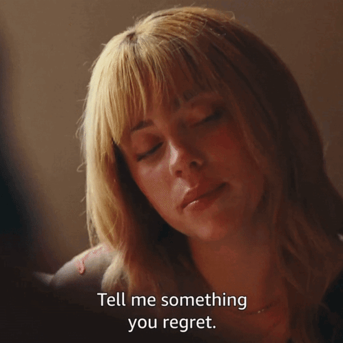 Billie Eilish looks down thoughtfully as the caption asks, 'Tell me something you regret.'