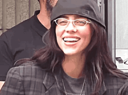 Billie Eilish smiles and makes a heart hands gesture, wearing glasses and a hat.