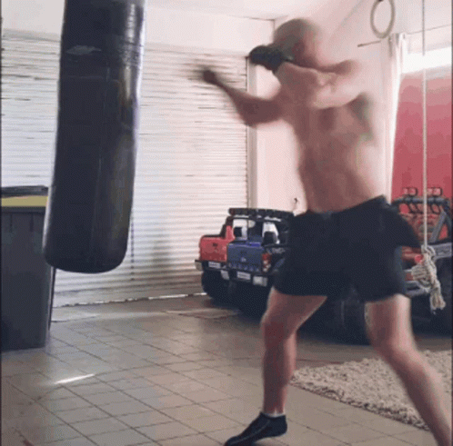 Willy 'Bim Bam' Weldens, a shirtless man, vigorously punches a heavy bag during a boxing workout in a garage.