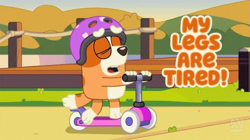 Bingo, the animated dog from Bluey, rides a pink scooter, exclaiming that her legs are tired.