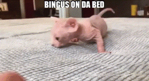 Bingus the Sphynx kitten is seen crawling and exploring on a bed, with the caption 'BINGUS ON DA BED'.