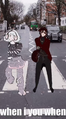 Bingus and Orithus characters perform a happy dance on the iconic Abbey Road zebra crossing.