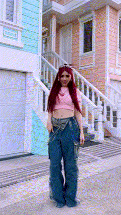 Mikha Lim from Bini performs a vibrant dance to 'Cherry On Top' in front of colorful houses.