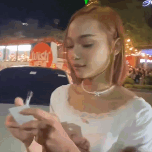 Bini Bini Gwen side eyeing while holding a spoon in front of a Wish sign at night.