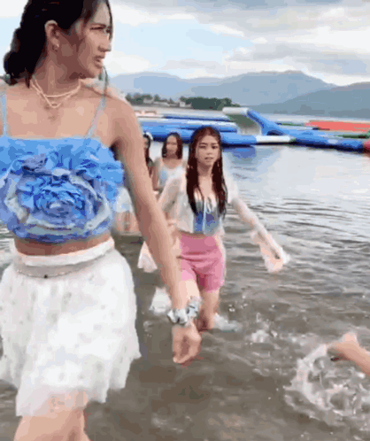 BINI member Mikha Lim and friends walk through shallow water at a water park, with inflatable obstacles visible.