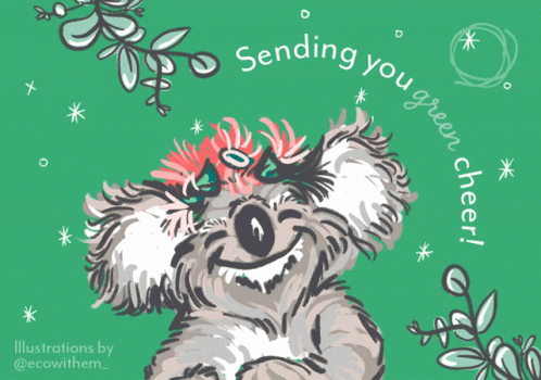 A cheerful koala illustration from Biome Eco Stores, sending green cheer with eucalyptus leaves.