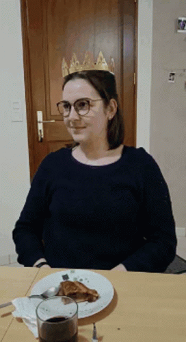 Laure, wearing a golden crown and glasses, laughs and smiles joyfully while sitting at a table.