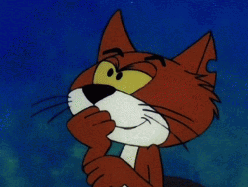 Mischievous cartoon cat from The Smurfs (Puffi) laughing with a sly expression, covering its mouth.