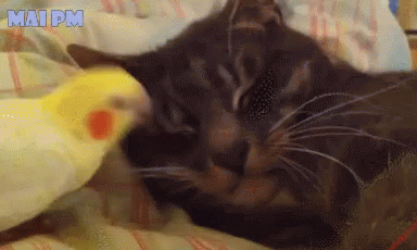 A yellow cockatiel gently pecks and licks a relaxed dark grey cat's nose and face.