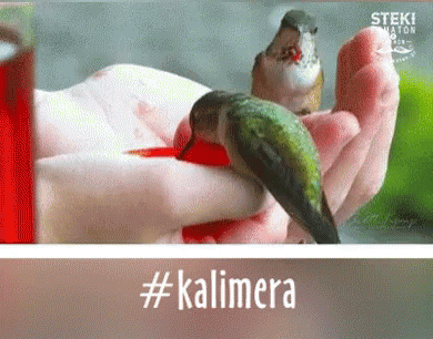 Two hummingbirds perch on a hand, feeding from a red feeder. The caption reads #kalimera.
