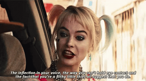 Harley Quinn delivers a sharp line about someone being a 'filthy little thief' in a scene from Birds of Prey.