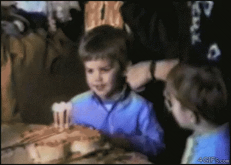 A boy is about to blow out his birthday candles when another child blows them out first, leading to a surprised and upset reaction.