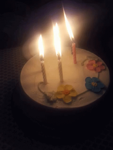 A white birthday cake with three lit candles and colorful flower decorations in a dark setting.
