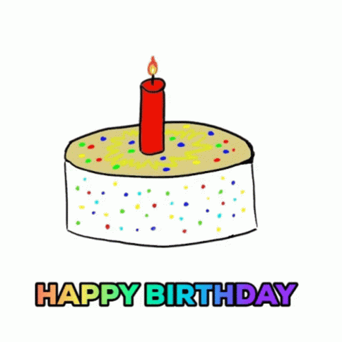 A colorful drawing of a birthday cake with a lit candle and sprinkles, wishing 'Happy Birthday'.