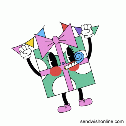 A cheerful cartoon gift box with arms, legs, and a bow, holding party banners and a noisemaker, celebrating a birthday.