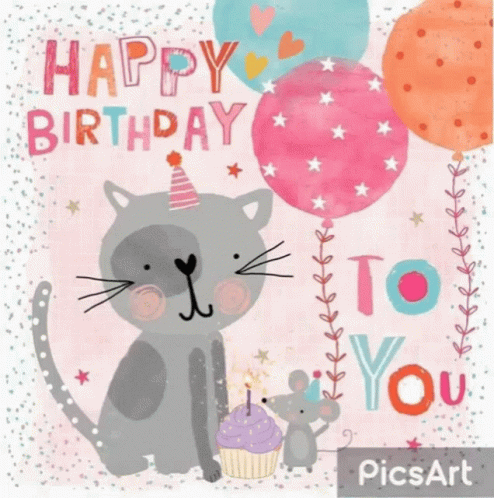 An animated birthday card featuring a cute cat and a mouse, surrounded by colorful balloons and hearts, wishing 'Happy Birthday to You'.
