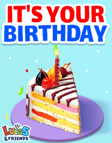 Celebrate with a delicious slice of birthday cake and a lit candle, wishing you a Happy Birthday from Lucas & Friends!