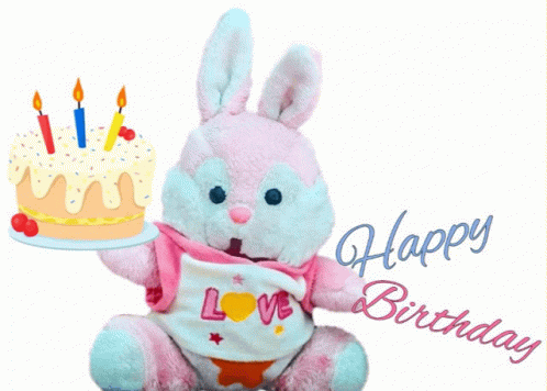 A cute pink stuffed bunny holds a birthday cake with candles, wishing happiness, health, money, and many carrots.